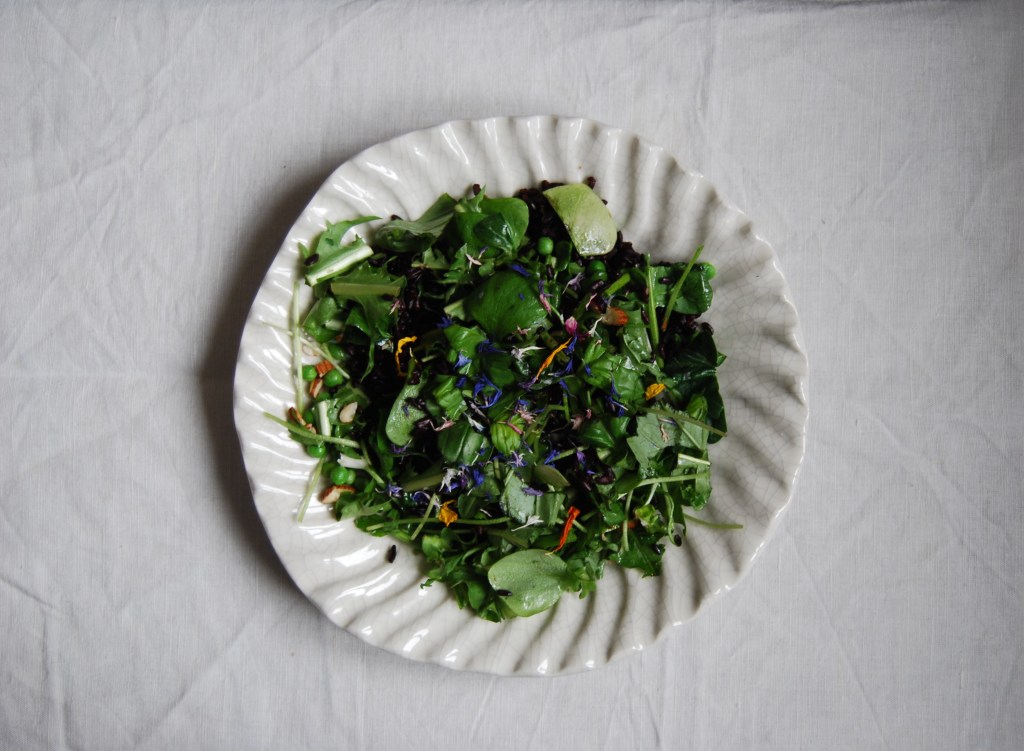 Assiette et tissu chinées; riz noir du Piémont; petits pois surgelés; amandes de Sicile; pourpier, épinard et pissenlit de la ferme de Domangeville (Pange); huile de cameline de la ferme Bel Air (Landroff); fleurs pour salade (bleuets, roses, tagètes) de Grünenfelder (Vaulion, Suisse).