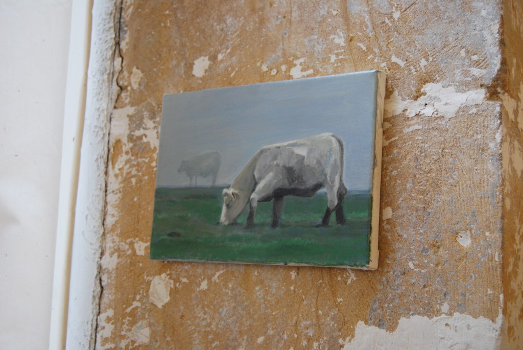 La première vache de 2020 porte les couleurs d’ici, celles du paysage lorrain : la palette du peintre est faite de gris, de vert, de blanc et de brun. Il y a une certaine mélancolie dans les paysages de Moselle, comme un spleen lorrain qui nous saisit quand on regarde par la fenêtre du train. Léo dessine à Sillegny, à Rémilly, à Ancerville ou à Puzieux. Il aime marcher et être dehors. Quand on s’en imprègne suffisamment, peut-être le paysage infuse-t-il en nous…