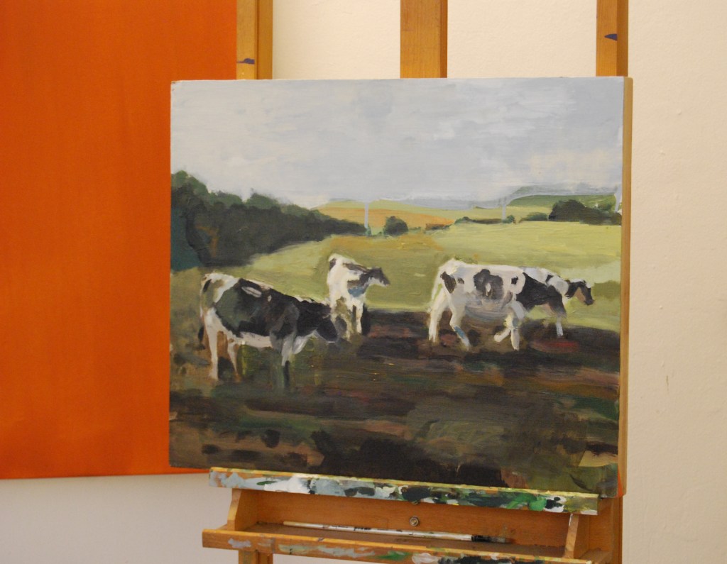 C’est pendant ses marches rimbaldiennes à Verny que Léo Faber a pour la première fois considéré la vache comme un sujet potentiel. Holstein, Salers, Normande : sa peinture l’a amené à se renseigner sur les différentes races, en rencontrant par exemple des éleveurs à Rémilly pour des croquis en étable.