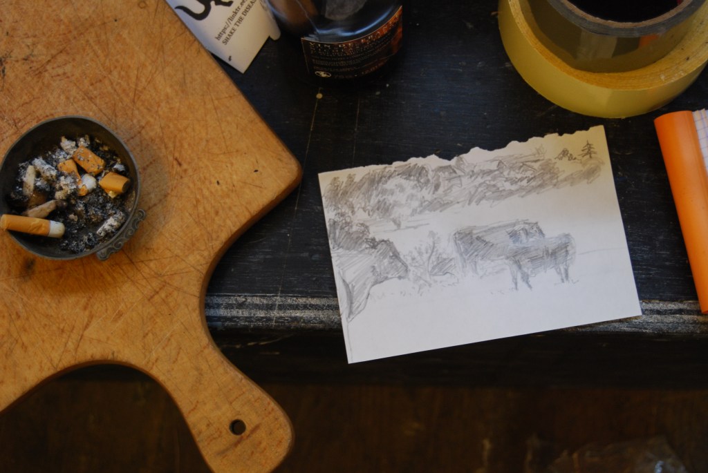 Léo Faber a appris à peindre en peignant. Aujourd’hui, il analyse ses dix années de pratique comme le passage de l’abstraction à un motif plus simple, plus humble et plus élémentaire. L’épure dans ses tableaux, le calme et le silence de ses paysages, la tranquillité de ses vaches : tout cela nous ramène à l’inspiration japonaise.
