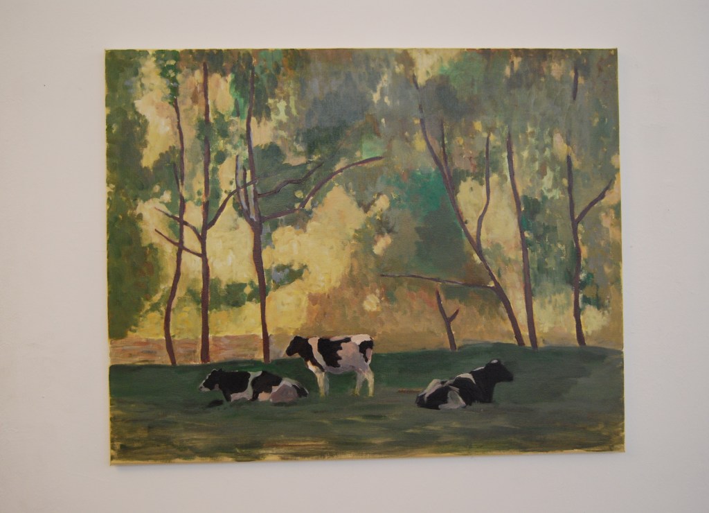 Léo Faber semble avoir fait le parcours inverse : quatre ans seulement séparent le tableau ci-dessous de son premier tableau de vache. De l’environnement urbain ont émergé des peintures d’inspiration moderne tendant vers l’expressionnisme abstrait ; elles ont été remplacées par le retour au paysage dans une peinture de campagne. Mais s’il assume jouer avec le kitsch, la peinture de Léo Faber n’a rien de chauvin. Analyser cette évolution uniquement en termes de rupture serait faire fausse route ; il faut plutôt lire ce cycle comme un mélange d’ancien et de nouveau, la maturation de ses expériences passées. Derrière les apparences, son travail très figuratif autour de la vache se nourrit des enseignements de l’abstraction.
